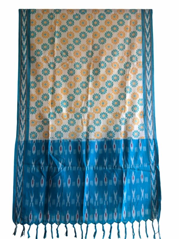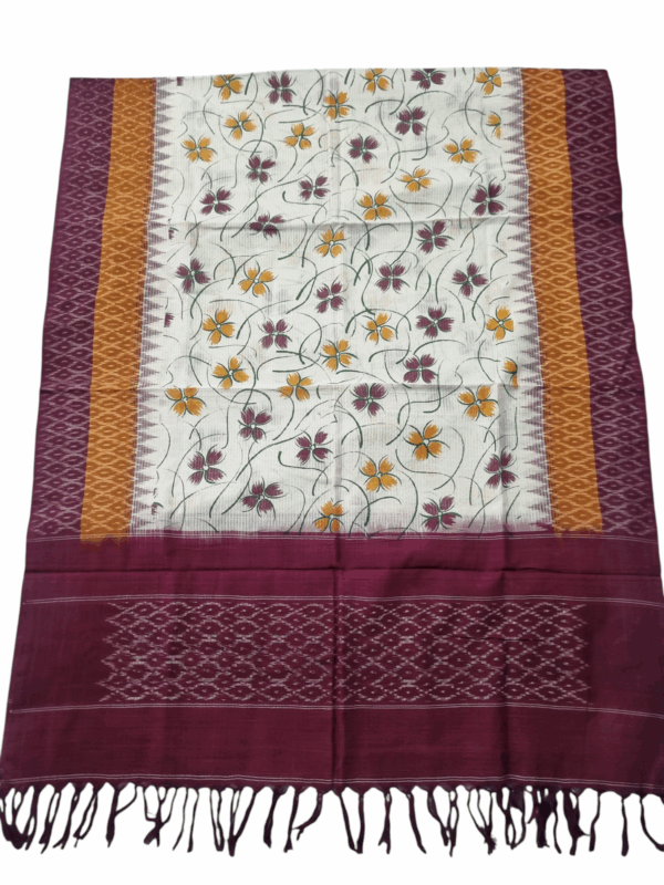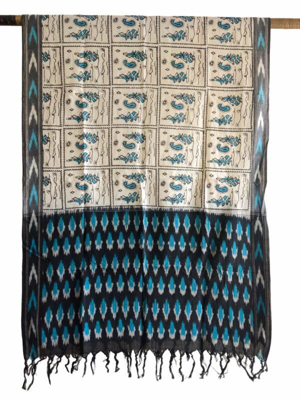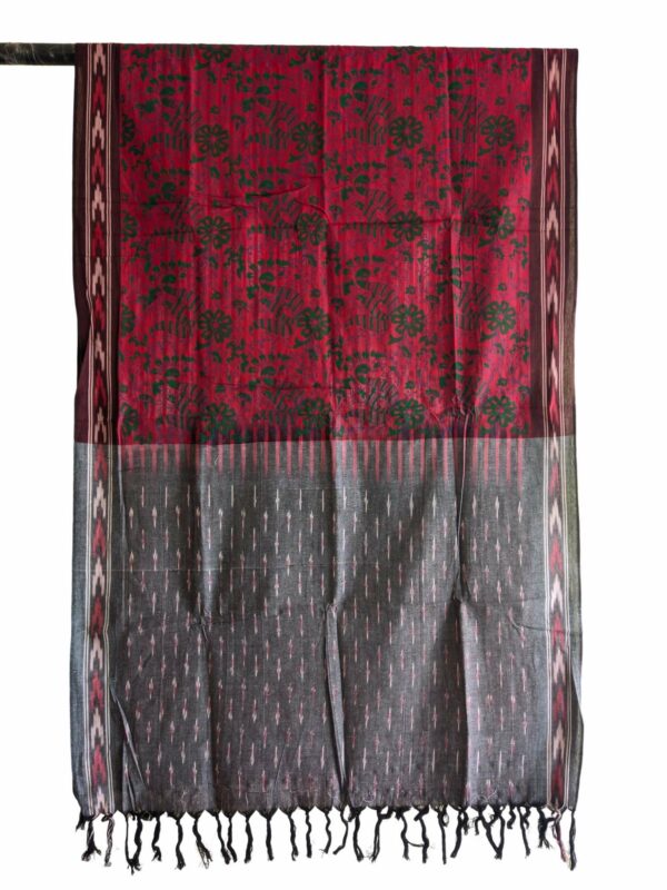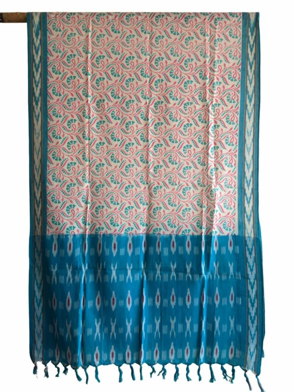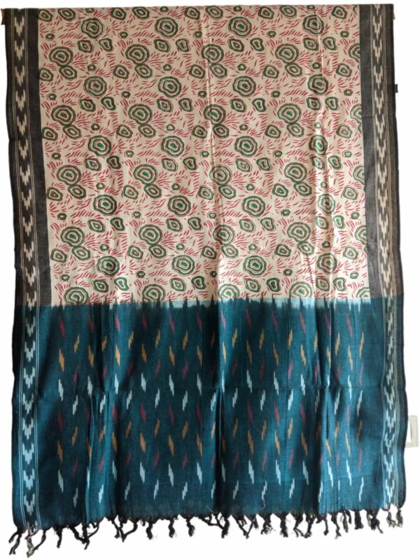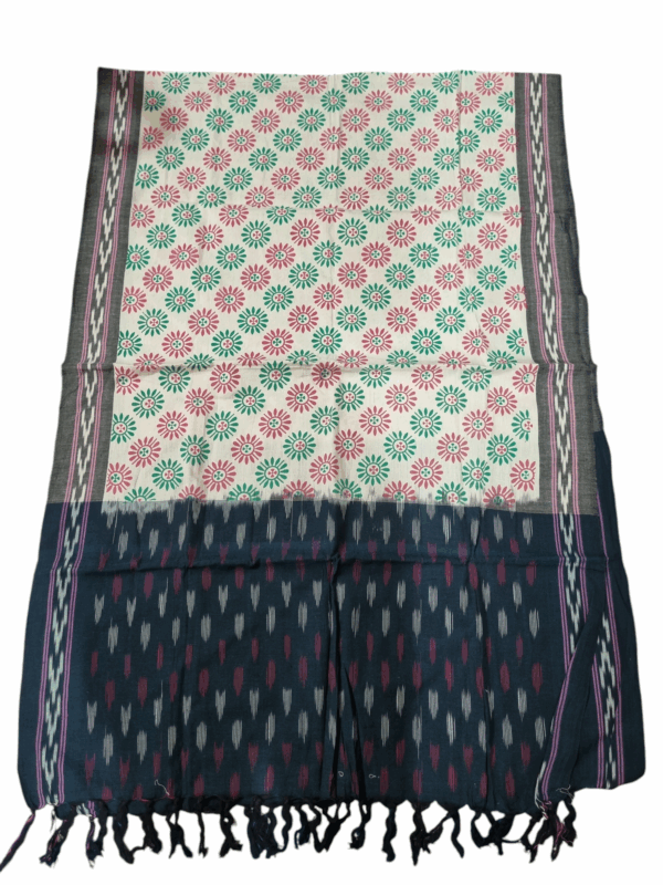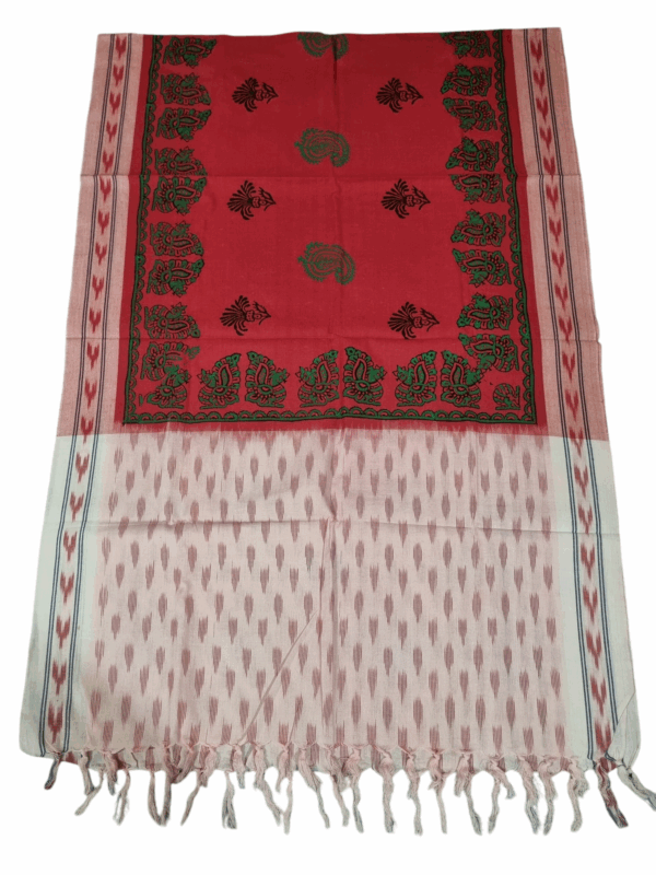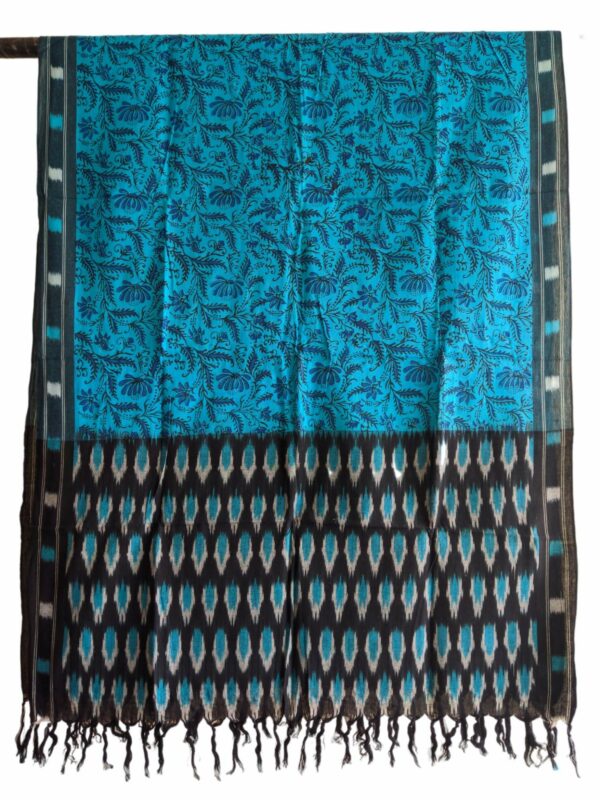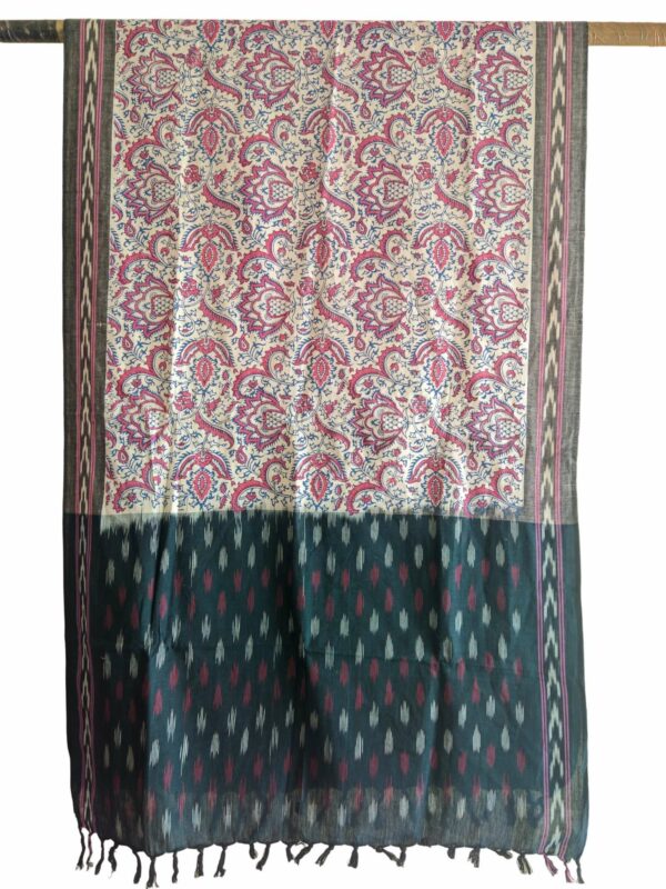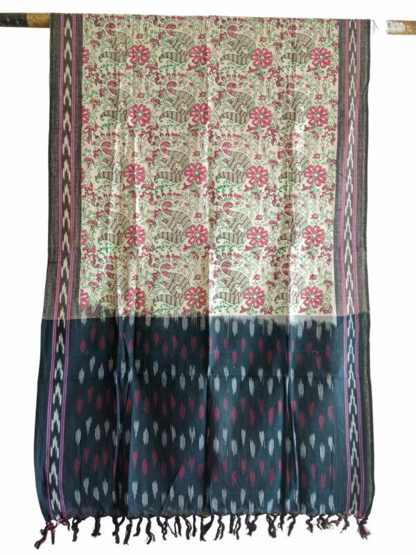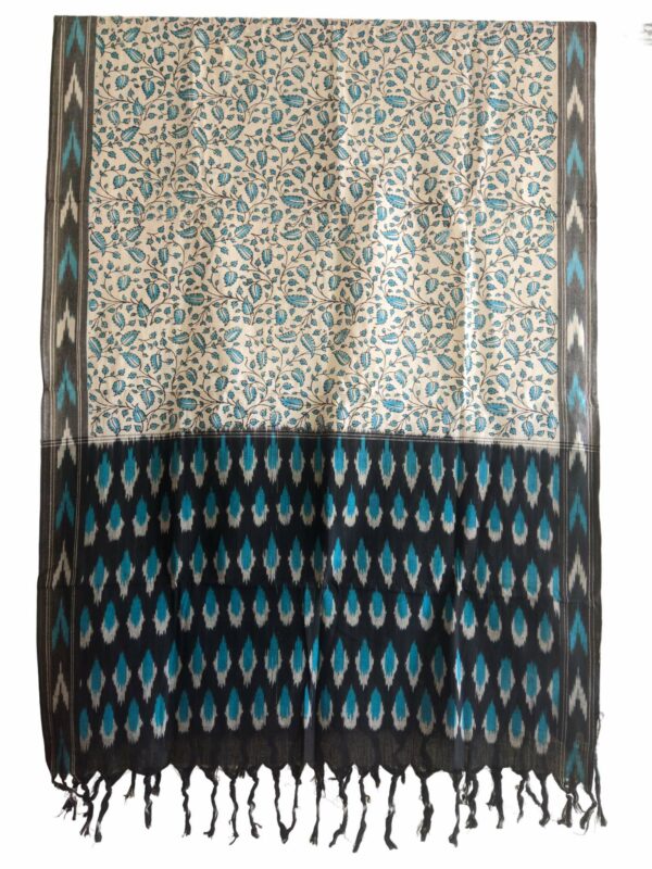 Elevate your ethnic wardrobe with this exquisite handwoven Ikat dupatta, beautifully enhanced with a vibrant Kalamkari-inspired floral print. Crafted on
