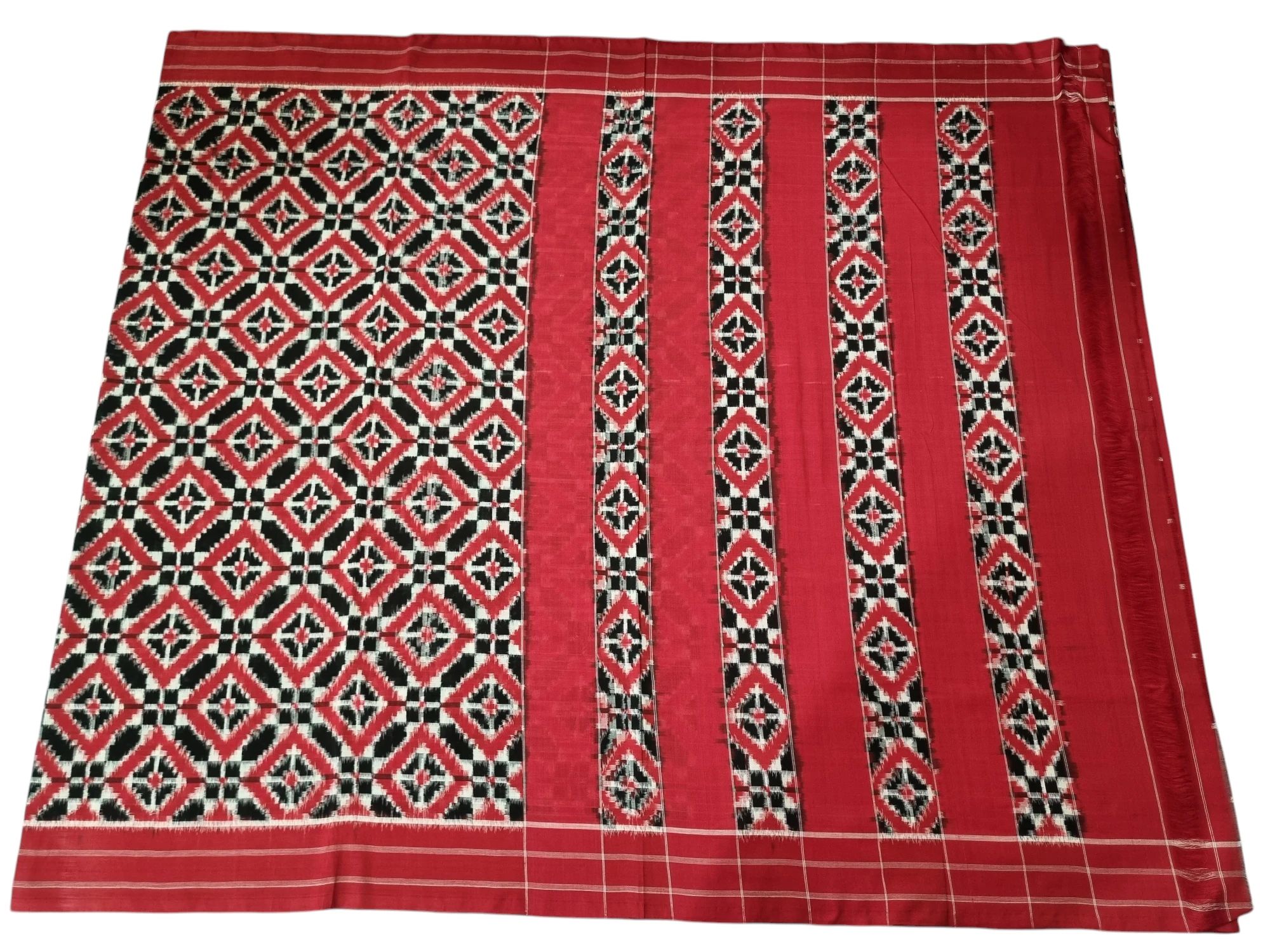 – **Authentic Handwoven Design:** This saree showcases the meticulous craftsmanship of double Ikat weaving, a technique that interlaces warp and weft threads before dyeing, resulting in stunning geometric patterns. The traditional red, black, and orange color scheme adds a touch of classic elegance to your wardrobe.