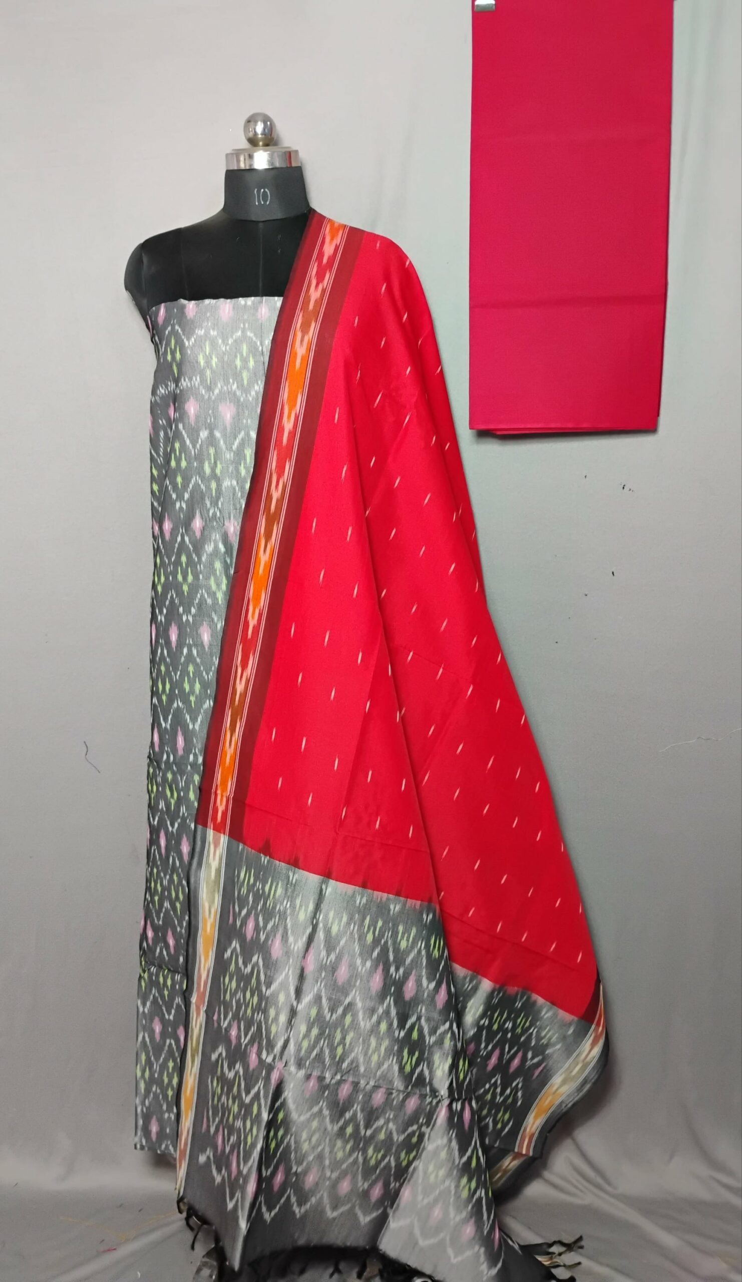 Upgrade your ethnic wardrobe with this stunning 3-piece Ikat dress material set, crafted from a soft and lustrous cotton silk blend. The set features a beautifully woven black Ikat patterned top (2.5 meters), a vibrant pink Ikat dupatta (2.5 meters) with intricate designs and multicolored borders, and a solid pink bottom fabric (2 meters) for a coordinated yet standout look. The cotton silk fabric ensures both comfort and a touch of luxury, making it perfect for festive occasions, office wear, or casual gatherings. Unstitched material allows for custom tailoring to your preferred fit and style. Ideal for anyone who appreciates the artistry and tradition of Ikat weaving.