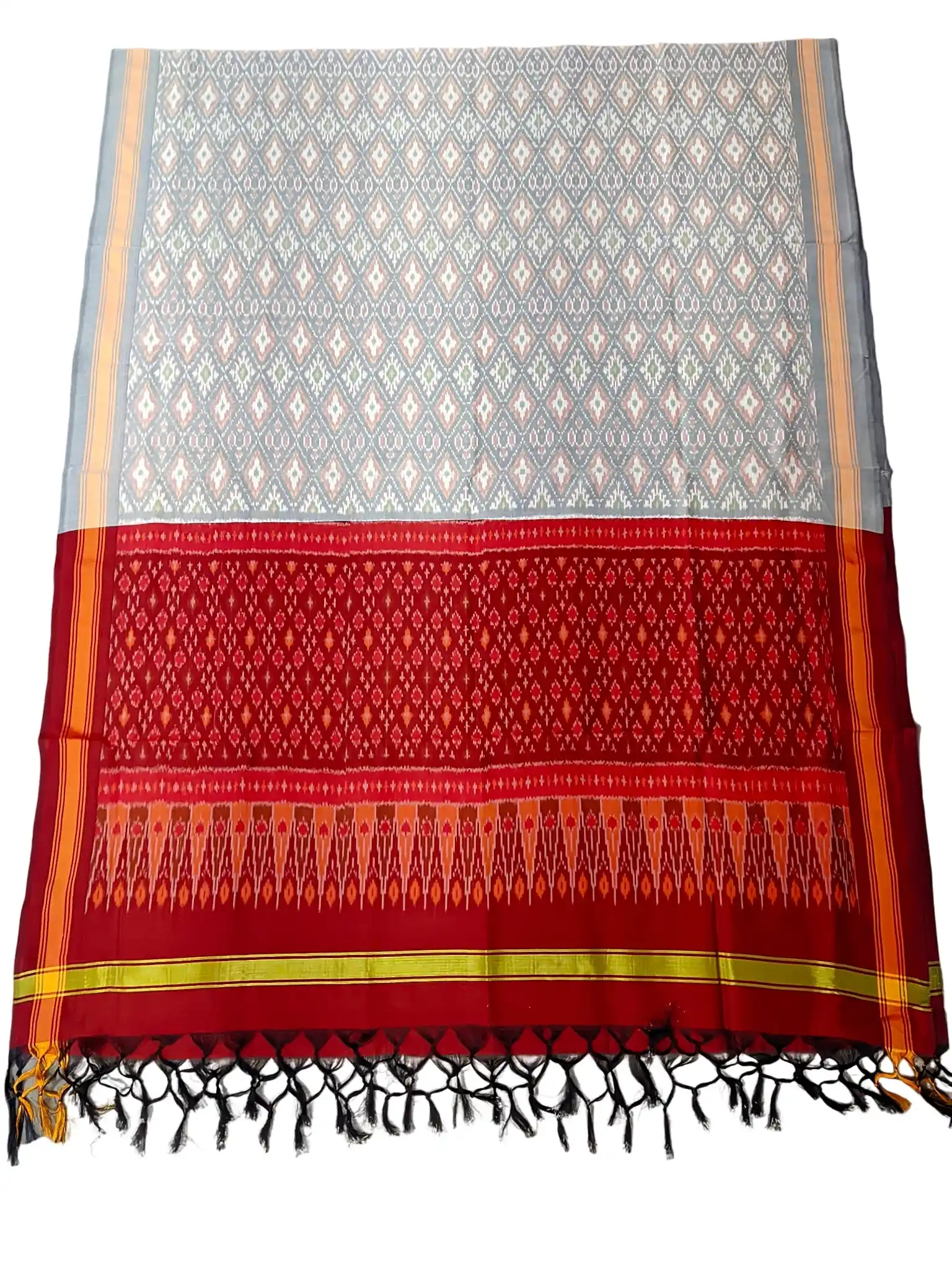 The hallmark of this dupatta is its intricate ikat patterns, a distinctive feature of Pochampally textiles. These patterns are created using a resist-dyeing technique, resulting in unique designs that are both timeless and contemporary.