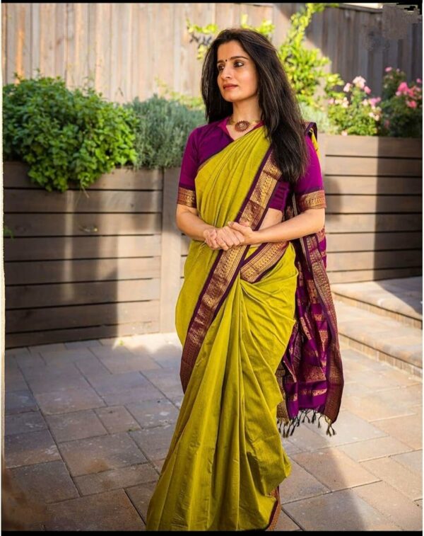 This pure cotton saree comes with a matching blouse piece, making it a complete set for effortless styling. Unlike mass-produced alternatives, our sarees are sourced directly from weavers, allowing us to offer them at lower prices compared to competitors, while ensuring fair wages and preserving traditional skills.