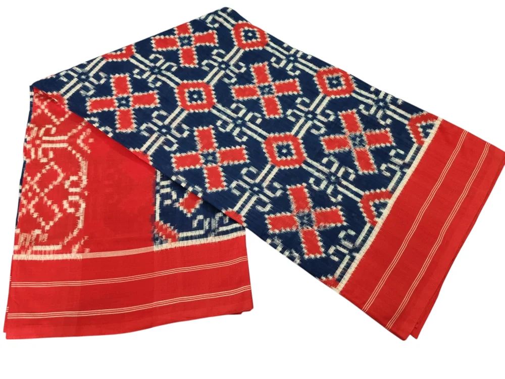 The highlight of this saree is its intricate double ikat pattern, achieved through a time-intensive dyeing process where both warp and weft threads are resist-dyed before weaving. The result is a stunningly symmetrical and vibrant Teliya design, unique to Pochampally’s weaving tradition.