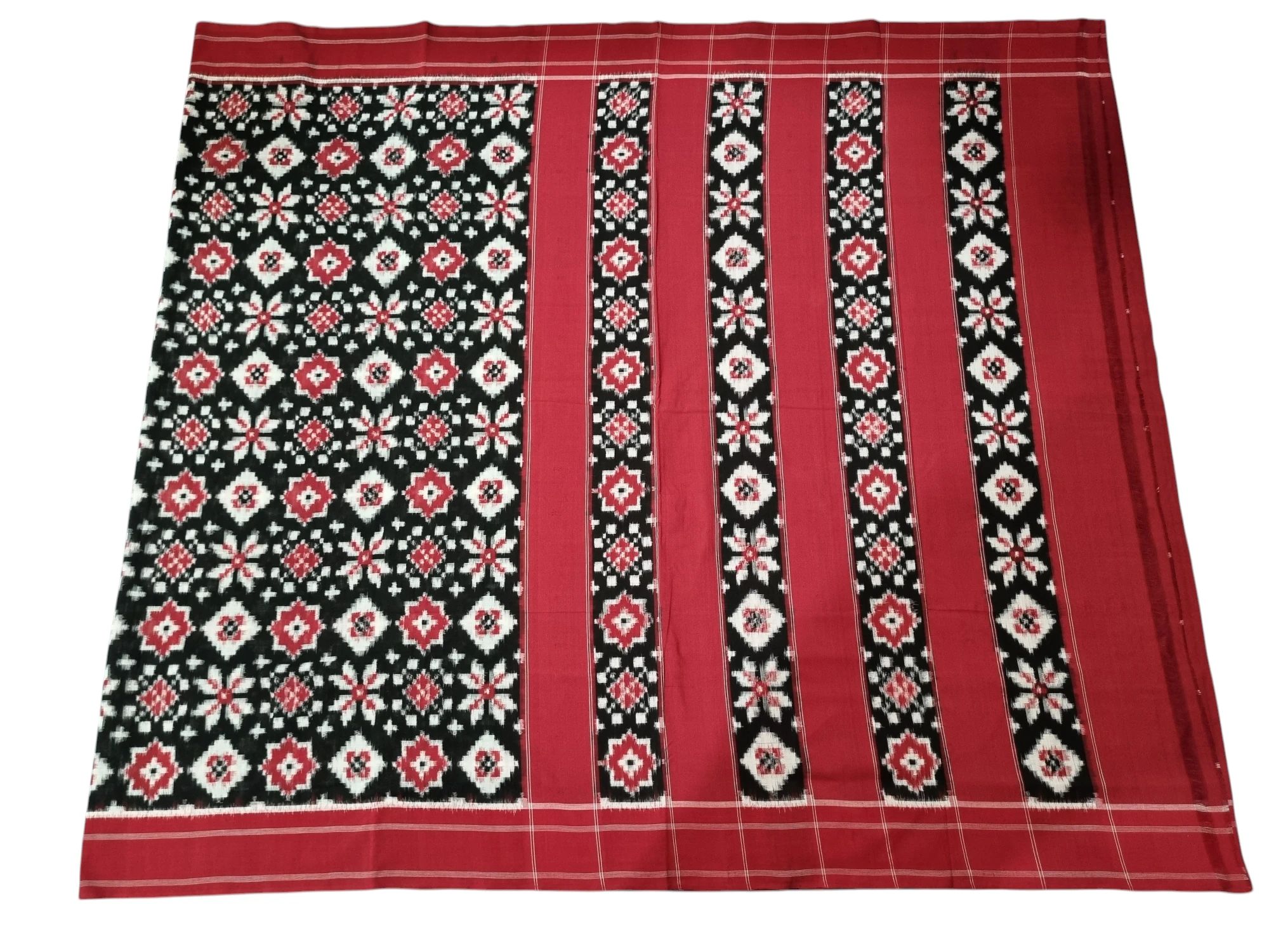The highlight of this saree is its intricate double ikat pattern, achieved through a time-intensive dyeing process where both warp and weft threads are resist-dyed before weaving. The result is a stunningly symmetrical and vibrant Teliya design, unique to Pochampally’s weaving tradition.