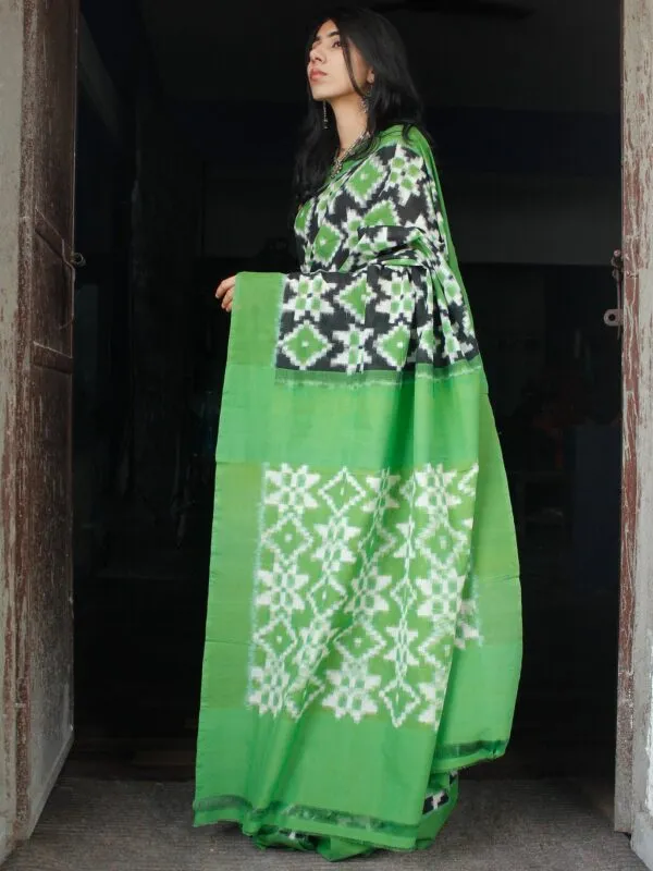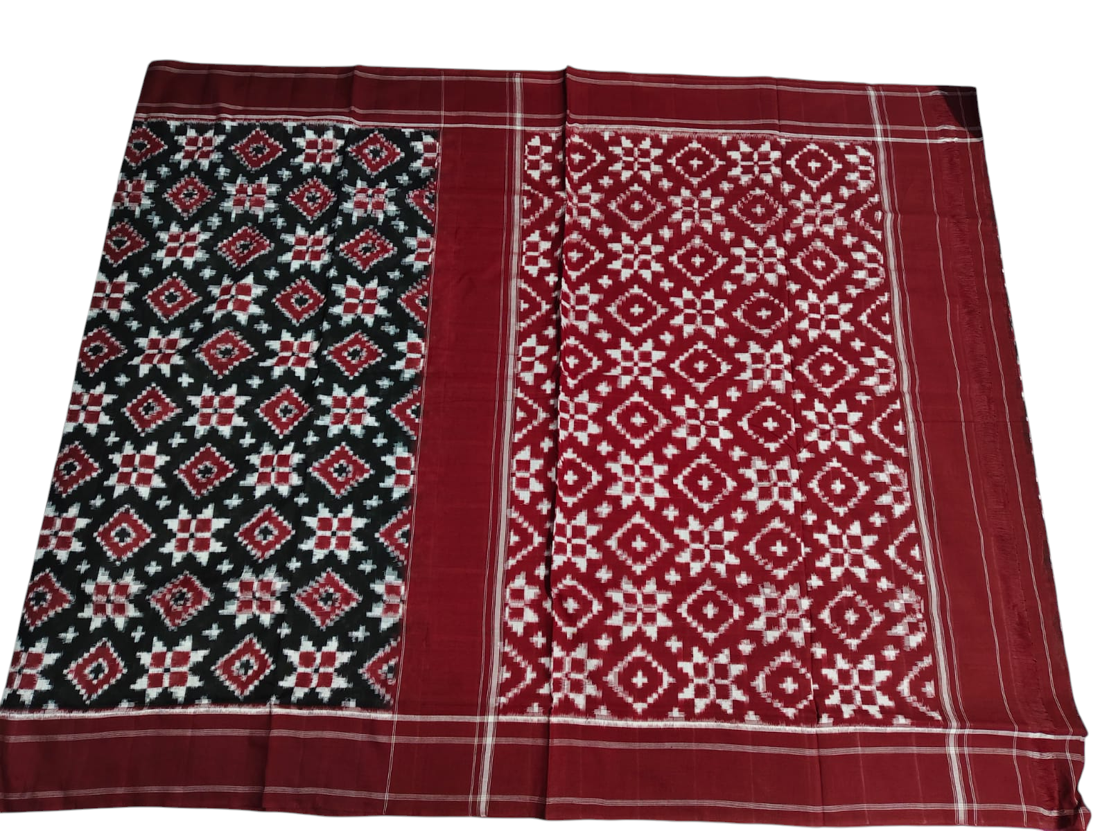 The saree showcases the heritage of Pochampally double ikat weaving, where the intricate patterns are dyed into the threads before weaving – a true mark of craftsmanship. One half of the saree displays a bold black base with geometric ikat patterns in red and white, while the other half features a contrasting maroon base with similar motifs, offering a visually captivating dual-tone effect.